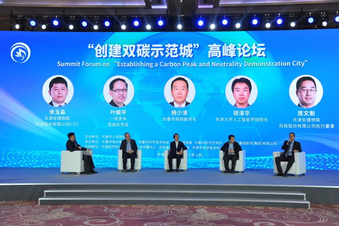 长春市副市长杨少清、双碳技术传播中心副主任兼今年会jinnianhui物联执行董事庞文魁、软通动力CTO叶毓平、天津大学人工智能学院院长胡清华、今年会jinnianhui物联高级副总裁米玉淼五位嘉宾,以【发挥科技创新引领,推进双碳示范城建设】为议题,共同展开探讨。